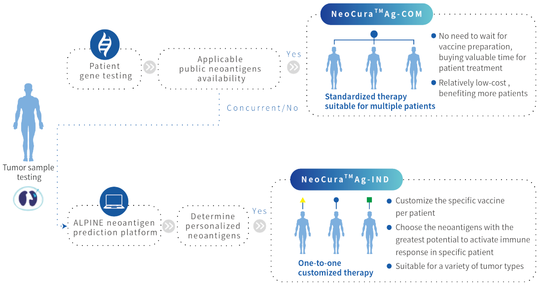 NeoCura Ag is a frontier treatment regimen based on the artificial intelligence (AI) technology. Through high-throughput sample sequencing and AI algorithm prediction, it identifies the optimal neoantigen fragments that can be efficiently bound to and presented by patients' tumor cells, so as to trigger the immune response of the body to tumor-specific mutants, then synthesizes the corresponding coding mRNA neoantigen preparations for tumor treatment. Compared to traditional drugs, NeoCura Ag features stronger immunogenicity that can induce specific anti-tumor immune response in humans.Based on its R&D experience and technical superiority, NeoCura develops personalized neoantigens for different individuals and establishes public neoantigen libraries for multiple types of cancers through sequencing and data analysis of large number of clinical samples collected from tumor patients, which significantly reduces the cost of neoantigen drug therapy and shortens the preparation time. So far, NeoCura has cooperated with many hospitals to conduct relevant trials.